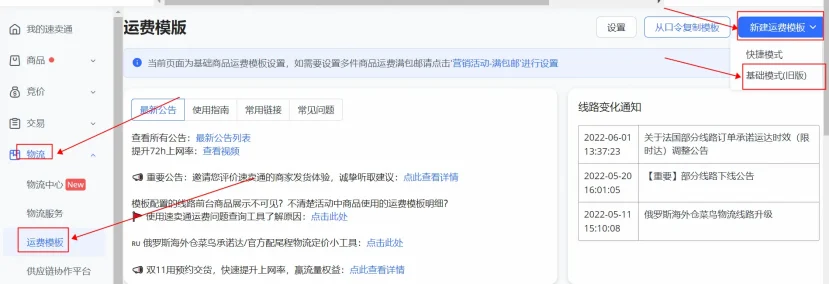 2.创建新模板:点击“新增运费模板”,选择“基础模式(旧版)”。