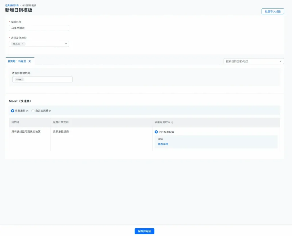 3.模板命名:建议使用清晰易懂的名称,例如 “Meest乌克兰专线”,选择发货地址,选择物流线路,选择Meest,然后点击保存。